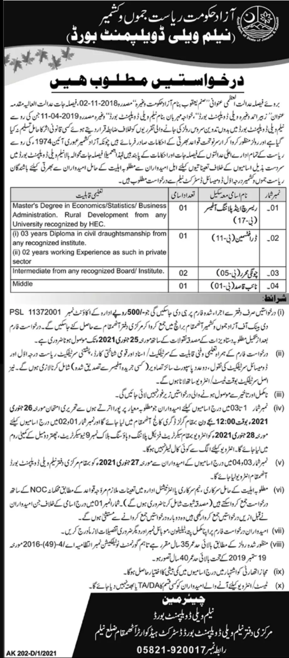 Jobs Neelam Valley Development Board AJK announce the career opportunities for the post of in for the fresh and experienced candidates on basis who have degree. Posted date of this post is 20/01/2021 and the last date is 25/01/2021. if you are eligible for this job apply before due date.