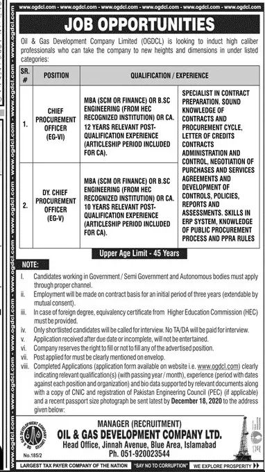 Jobs Oil & Gas Development (OGDCL) Company Ltd announce the career opportunities for the post of in for the fresh and experienced candidates on basis who have degree. Posted date of this post is 29/11/2020 and the last date is 18/12/2020. if you are eligible for this job apply before due date.