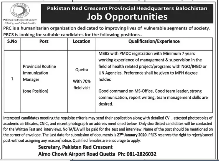Jobs Pakistan Red Crescent Society Balochsitan