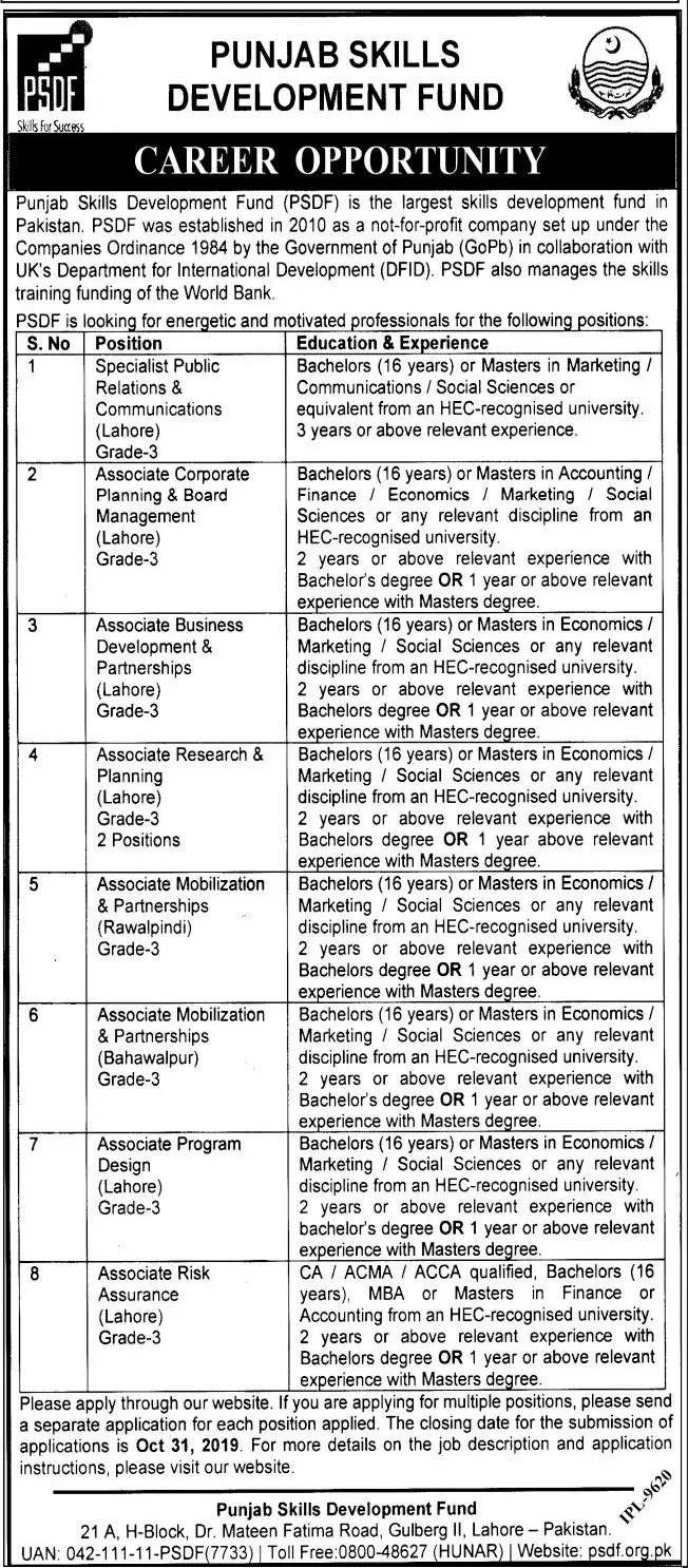 Punjab Skills Development Fund PSDF Lahore Jobs 2025