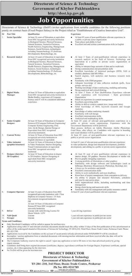 Jobs Science & Technology and Information Technology KPK announce the Permanent career opportunities for the post of See Below Ad in Khyber Pakhtunkhwa for the fresh and experienced candidates on Permanent basis who have Check Advertisement degree. Posted date of this post is 21/04/2020 and the last date is 04/05/2020. if you are eligible for this job apply before due date.