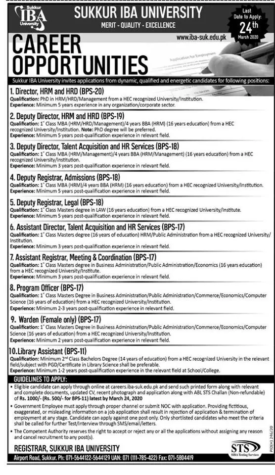 Jobs Sukkur IBA University Sukkur announce the Contract career opportunities for the post of See Below Ad in Sindh,Sukkur for the fresh and experienced candidates on Contract basis who have Check Advertisement degree. Posted date of this post is 09/03/2020 and the last date is 24/03/2020. if you are eligible for this job apply before due date.