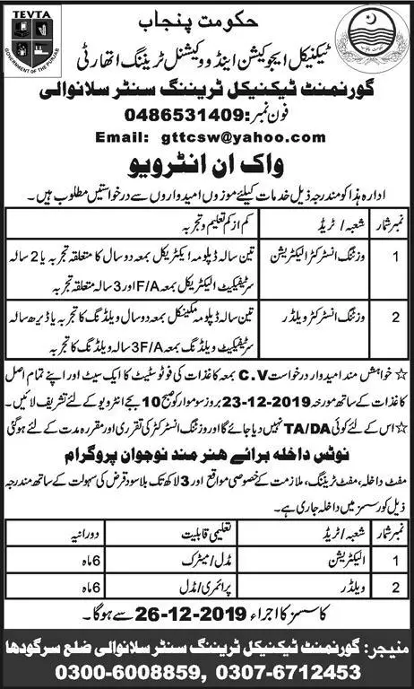 Government Technical Training Institute Gujranwala Jobs 2025