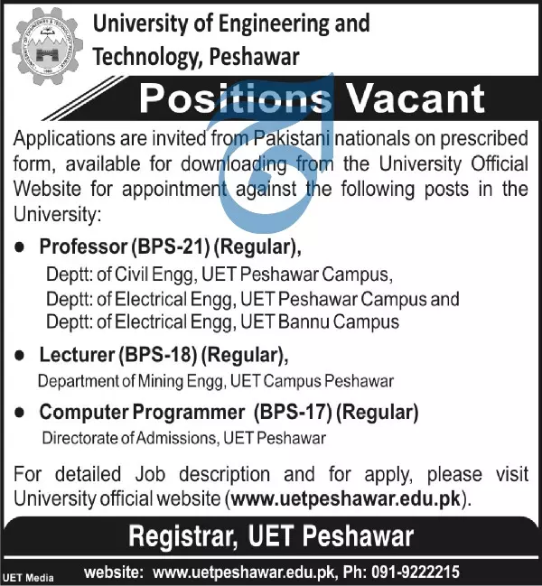 Jobs University of Engineering and Technology Peshawar announce the Contract career opportunities for the post of See Below Ad in Khyber Pakhtunkhwa for the fresh and experienced candidates on Contract basis who have Check Advertisement degree. Posted date of this post is 26/12/2019 and the last date is 09/01/2020. if you are eligible for this job apply before due date.