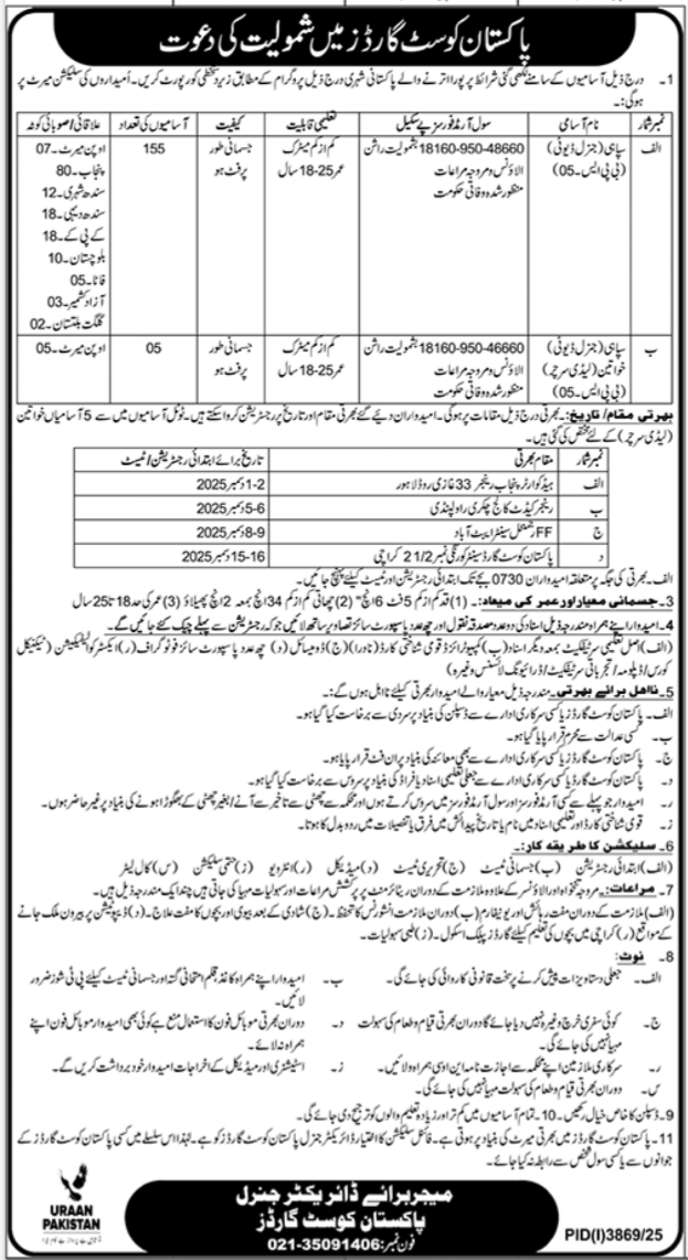 Join Pakistan Coast Guards Now As Sipahi 2025 announce the Contract career opportunities for the post of See Below Ad in Balochistan, Quetta for the fresh and experienced candidates on Contract basis who have Check Advertisement degree. Posted date of this post is 10/11/2025 and the last date is 24/11/2025. if you are eligible for this job apply before due date.