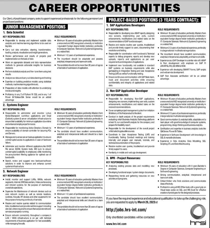 data scientist, network engineer,sap application developer, system engineer and non sap application developer Educational qualifications required Master, Bachelor, BIT and MIT etc. Latest IT jobs and others Private jobs in Human Resource Solution International HRSI closing date is around March 26, 2023, see exact from ad.