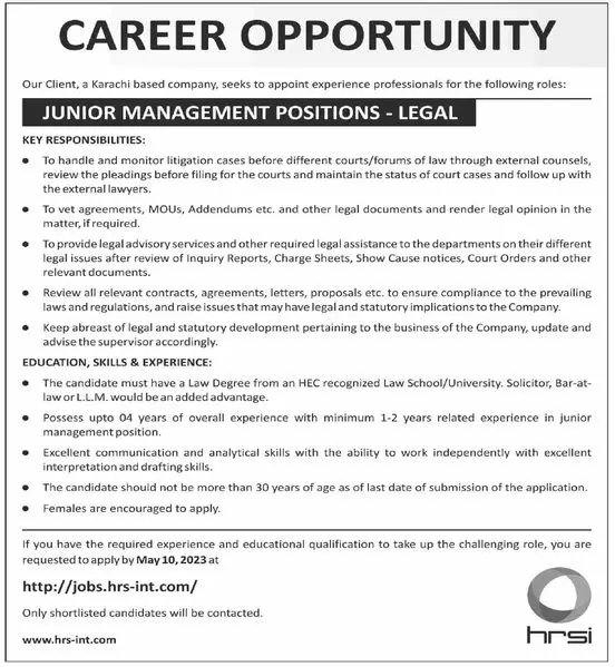 - • The candidate must have a Law Degree from an HEC recognized Law School/University. Solicitor, Bar-at- law or L.L.M. would be an added advantage.Possess upto 04 years of overall experience with minimum 1-2 years related experience in junior management position.
