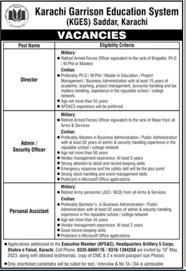 - Only experienced educationists are eligible. They can forward their CVs to the Executive Member (APS&C), Headquarters Artillery 5 Corps, Shahrah E Faisal, Karachi, by 10th May 2023.