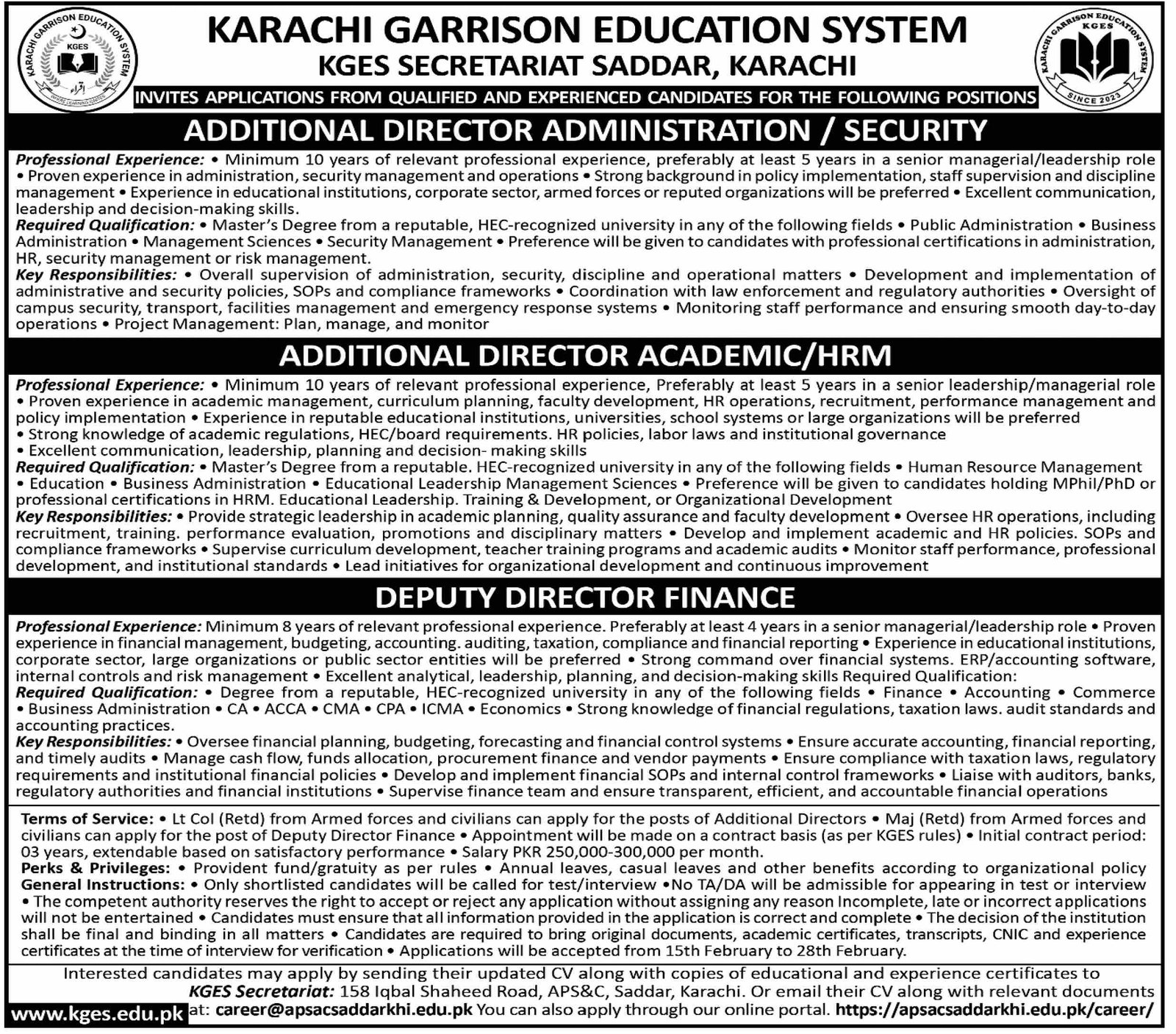 Karachi Garrison Education System KGES Jobs 2026 announce the Contract career opportunities for the post of See Below Ad in Sindh, Karachi for the fresh and experienced candidates on Contract basis who have Check Advertisement degree. Posted date of this post is 15/02/2026 and the last date is 02/03/2026. if you are eligible for this job apply before due date.
