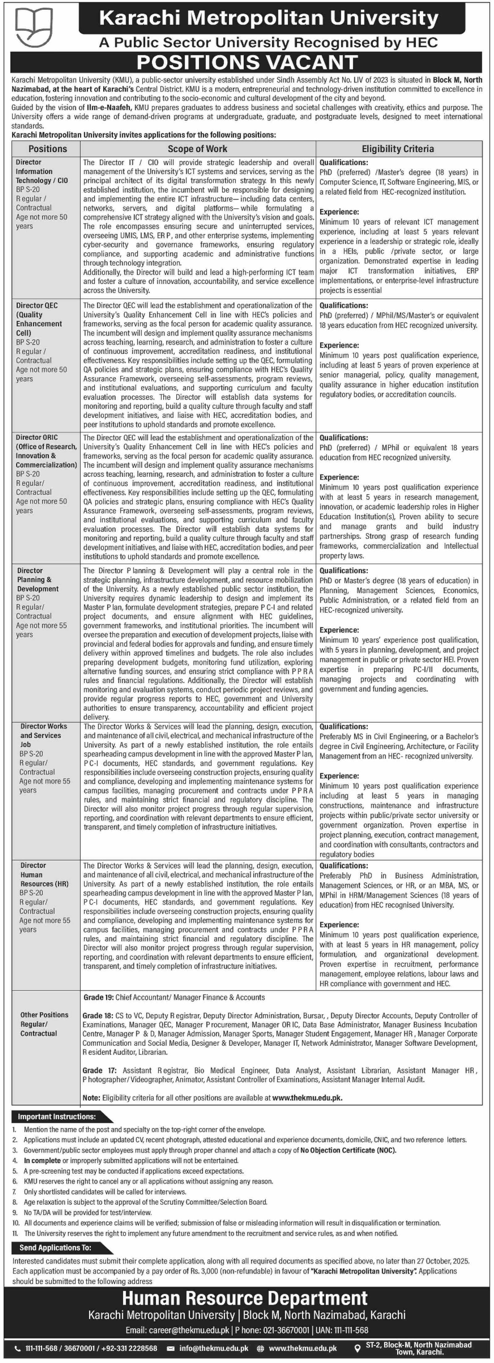 Karachi Metropolitan University invites applications for the following positions on a contract basis. The applicants must possess strong leadership and management skills, good interpersonal and communication skills, and the ability to work in a collaborative environment. K.M.U is committed to academic excellence, fostering innovation, and creativity. We aim to provide an inclusive and diverse learning environment for our students.