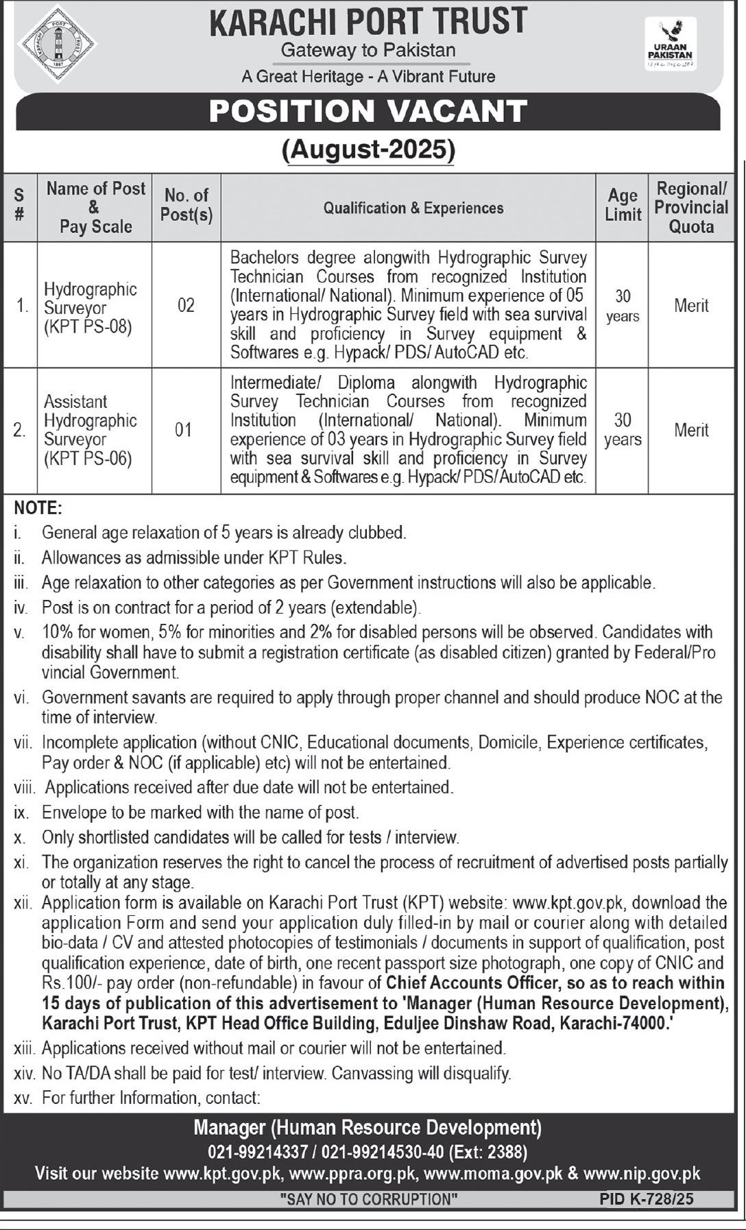 Karachi Port Trust Jobs 2025 For Hydrographic Surveyor announce the Contract career opportunities for the post of See Below Ad in Sindh, Karachi for the fresh and experienced candidates on Contract basis who have Check Advertisement degree. Posted date of this post is 28/08/2025 and the last date is 11/09/2025. if you are eligible for this job apply before due date.