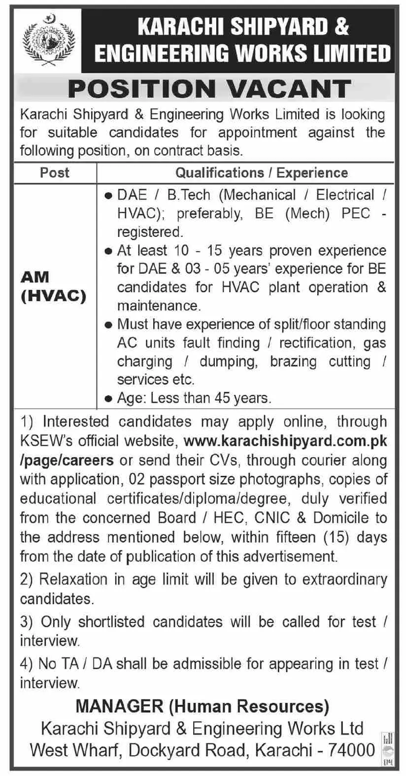 Interested candidates may apply online, through KSEW's official website, www.karachishipyard.com.pk /page/careers or send their CVs, through courier along with application, 02 passport size photographs, copies of educational certificates/diploma/degree, duly verified from the concerned Board / HEC, CNIC & Domicile to the address mentioned below, within fifteen (15) days from the date of publication of this advertisement.