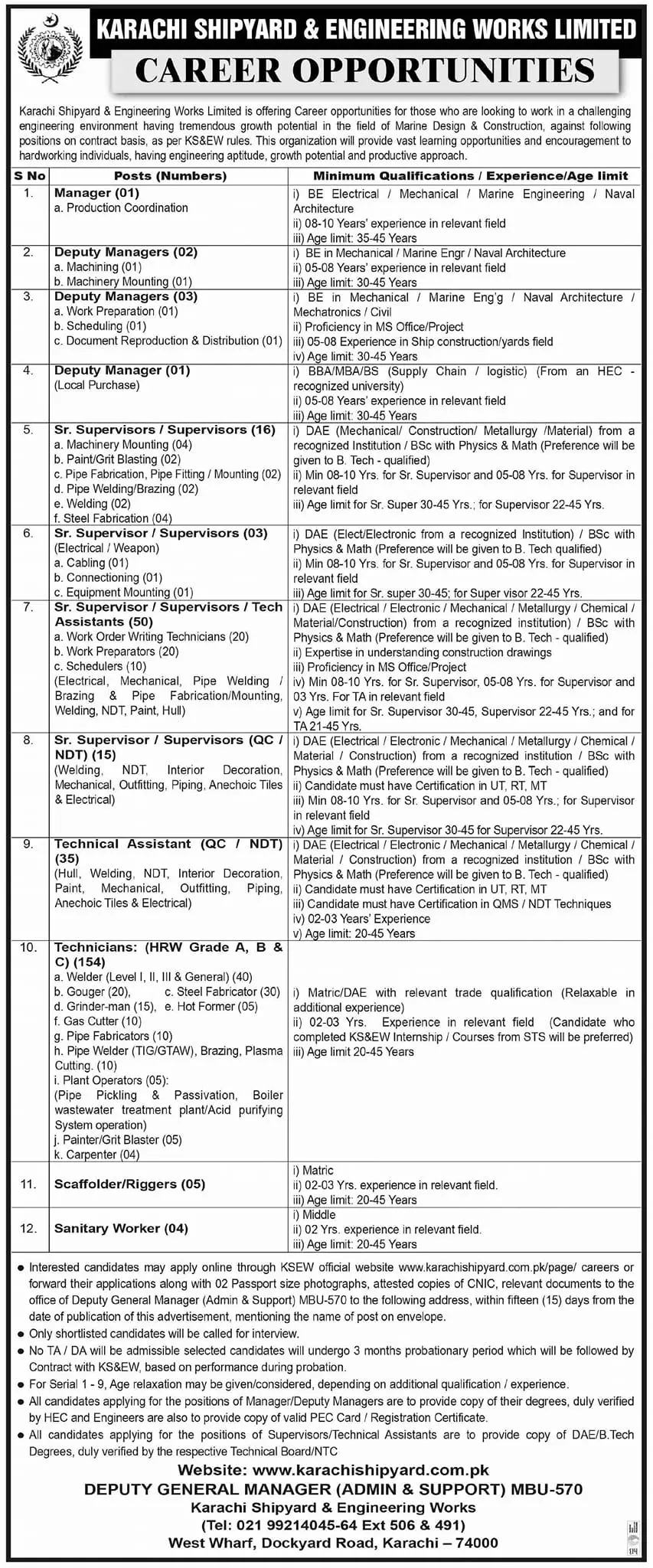 - Karachi Shipyard and Engineering Works Limited seek applications to recruit a DGM – Internal Audit, Managers, Deputy Managers, Senior Supervisors, Supervisors, Tech Assistants, Technical Assistants, Technicians, Scaffolders/Riggers, and Sanitary Workers.