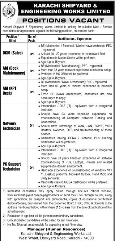1) Interested candidates may apply online through KSEW's official website, www.karachishipyard.com.pk/page/careers or send their CVs, through courier, along with application, 02 passport size photographs, copies of educational certificates/diploma/degree, duly verified from the concerned Board / HEC, CNIC & Domicile to the address mentioned below, within fifteen (15) days from the date of publication of this advertisement.