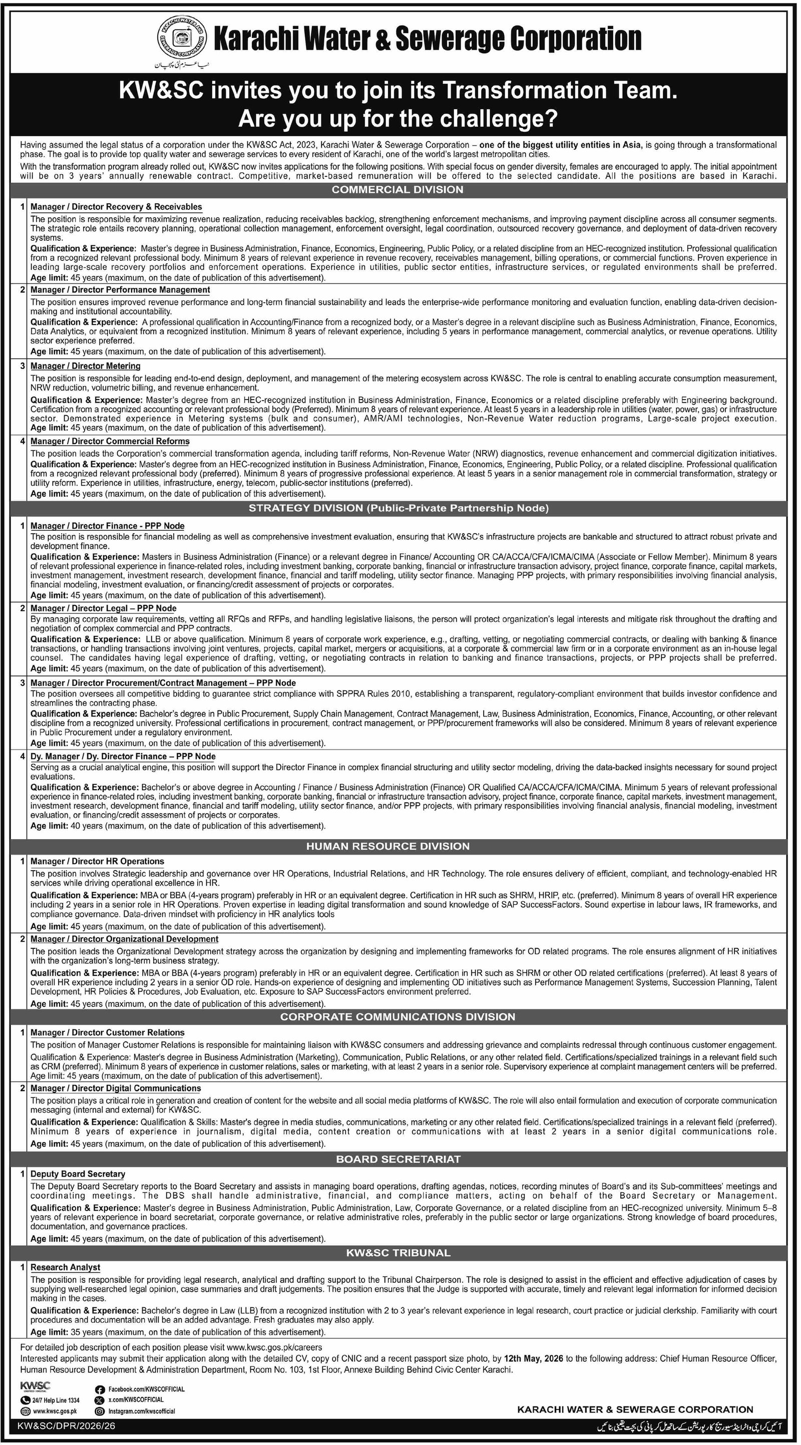 Karachi Water & Sewerage Corporation (KW&SC). They are looking for professionals to join their "Transformation Team" for various roles across several divisions.