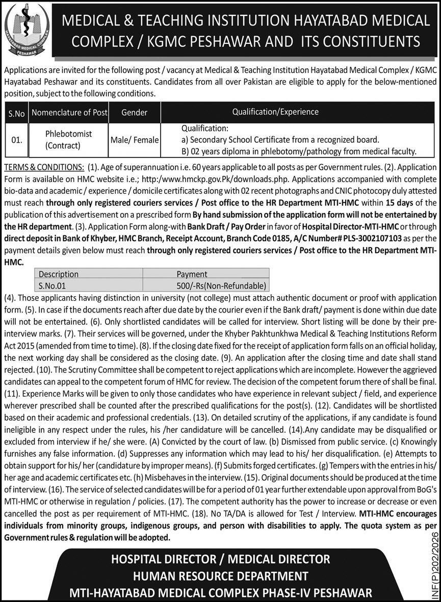 TERMS & CONDITIONS: (1). Age of superannuation i.e. 60 years applicable to all posts as per Government rules. (2). Application Form is available on HMC website i.e.; http:/www.hmckp.gov.Pk/downloads.php. Applications accompanied with complete bio-data and academic/experience/domicile certificates along with 02 recent photographs and CNIC photocopy duly attested must reach through only registered couriers services / Post office to the HR Department MTI-HMC within 15 days of the publication of this advertisement on a prescribed form By hand submission of the application form will not be entertained by the HR department. (3). Application Form along-with Bank Draft/Pay Order in favor of Hospital Director-MTI-HMC or through direct deposit in Bank of Khyber, HMC Branch, Receipt Account, Branch Code 0185, A/C Number# PLS-3002107103 as per the payment details given below must reach through only registered couriers services / Post office to the HR Department MTI-HMC.