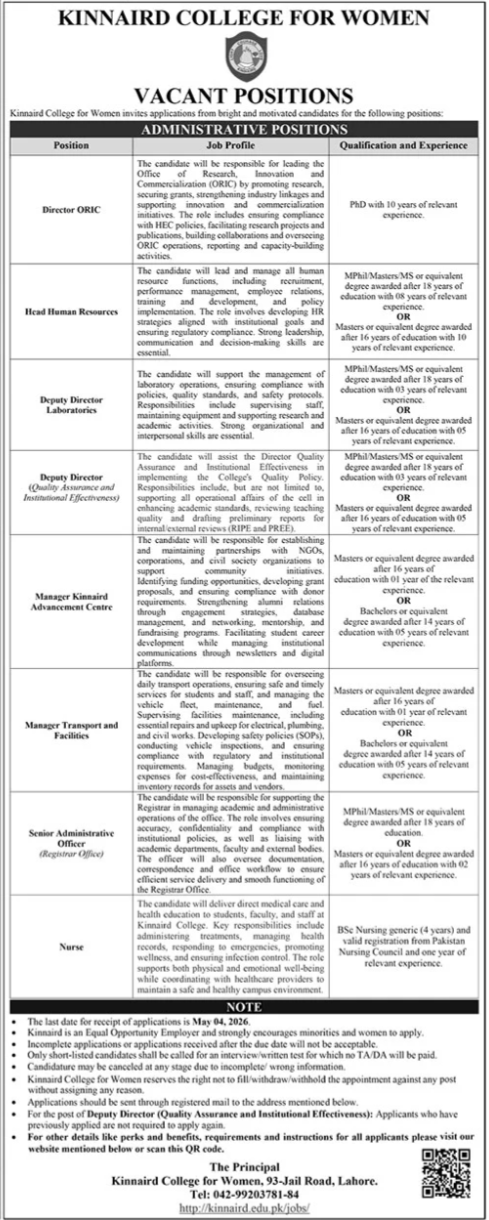 Kinnaird College for Women KCW Lahore Jobs 2026 announce the Contract career opportunities for the post of See Below Ad in Punjab, Lahore for the fresh and experienced candidates on Contract basis who have Check Advertisement degree. Posted date of this post is 19/04/2026 and the last date is 04/05/2026. if you are eligible for this job apply before due date.