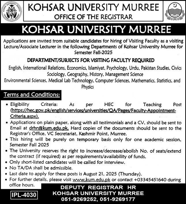 Kohsar University Murree KUM Jobs 2025 For Lecturers announce the Contract career opportunities for the post of See Below Ad in Punjab, Murree for the fresh and experienced candidates on Contract basis who have Check Advertisement degree. Posted date of this post is 12/08/2025 and the last date is 21/08/2025. if you are eligible for this job apply before due date.