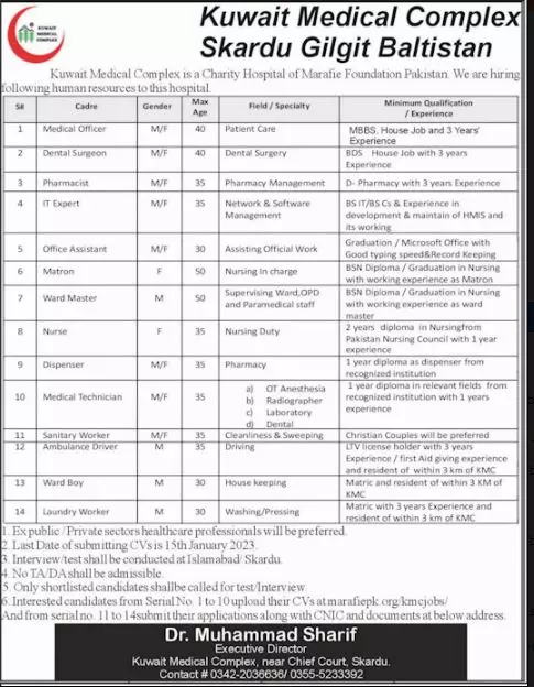Kuwait Medical Complex Skardu Gilgit Baltistan Jobs 2023 announce the Contract career opportunities for the post of See Below Ad in Gilgit Baltistan, Skardu for the fresh and experienced candidates on Contract basis who have Check Advertisement degree. Posted date of this post is 01/01/2023 and the last date is 15/01/2023. if you are eligible for this job apply before due date.