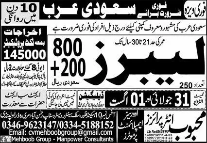 Labor Jobs Career Opportunity In Saudi Arabia 2023 announce the Contract career opportunities for the post of See Below Ad in Saudi Arabia for the fresh and experienced candidates on Contract basis who have Check Advertisement degree. Posted date of this post is 27/07/2023 and the last date is 01/08/2023. if you are eligible for this job apply before due date.