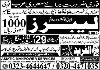 Labor Jobs Career Opportunity In Saudi Arabia 2023 announce the Contract career opportunities for the post of See Below Ad in Saudi Arabia for the fresh and experienced candidates on Contract basis who have Check Advertisement degree. Posted date of this post is 26/08/2023 and the last date is 29/08/2023. if you are eligible for this job apply before due date.