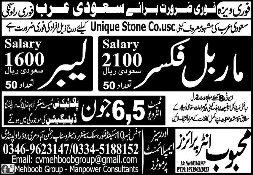 Labor & Marble Fixer Jobs 2023 In Saudi Arabia announce the Contract career opportunities for the post of See Below Ad in Saudi Arabia for the fresh and experienced candidates on Contract basis who have Check Advertisement degree. Posted date of this post is 03/06/2023 and the last date is 06/06/2023. if you are eligible for this job apply before due date.