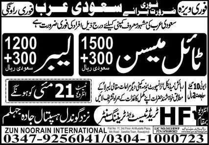 Labor & Tile Mason Jobs 2023 In Saudi Arabia announce the Contract career opportunities for the post of See Below Ad in Saudi Arabia for the fresh and experienced candidates on Contract basis who have Check Advertisement degree. Posted date of this post is 17/05/2023 and the last date is 21/05/2023. if you are eligible for this job apply before due date.