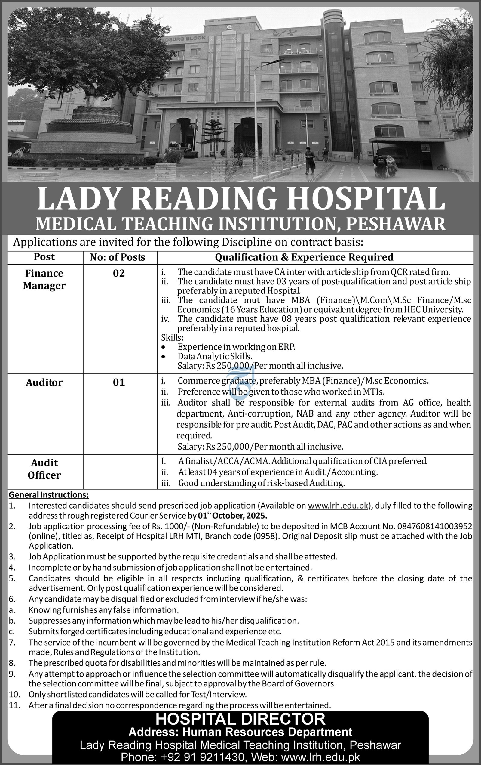 Lady Reading Hospital LRH MTI Peshawar Jobs 2025 announce the Contract career opportunities for the post of See Below Ad in Khyber Pakhtunkhwa, Peshawar for the fresh and experienced candidates on Contract basis who have Check Advertisement degree. Posted date of this post is 17/09/2025 and the last date is 01/10/2025. if you are eligible for this job apply before due date.