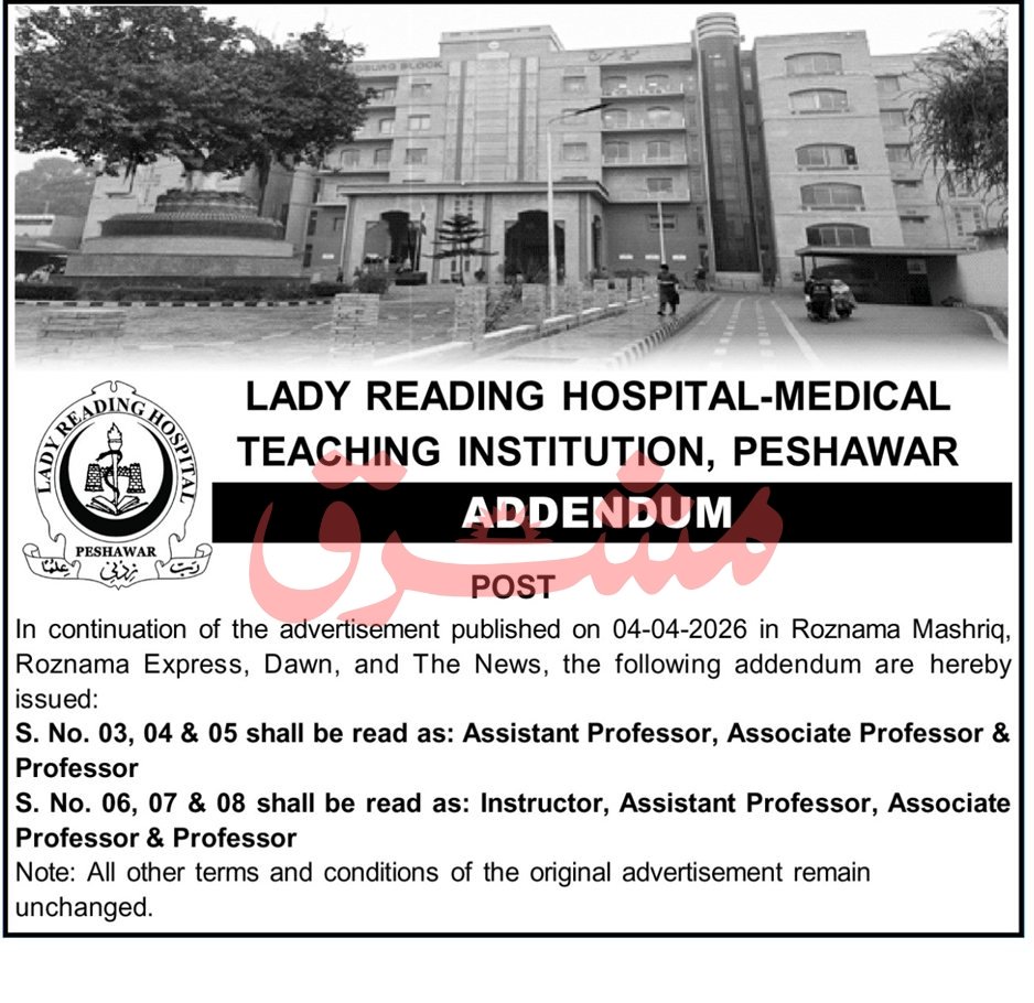 Lady Reading Hospital Peshawar Jobs 2026 announce the Contract career opportunities for the post of See Below Ad in Khyber Pakhtunkhwa, Peshawar for the fresh and experienced candidates on Contract basis who have Check Advertisement degree. Posted date of this post is 09/04/2026 and the last date is 24/04/2026. if you are eligible for this job apply before due date.