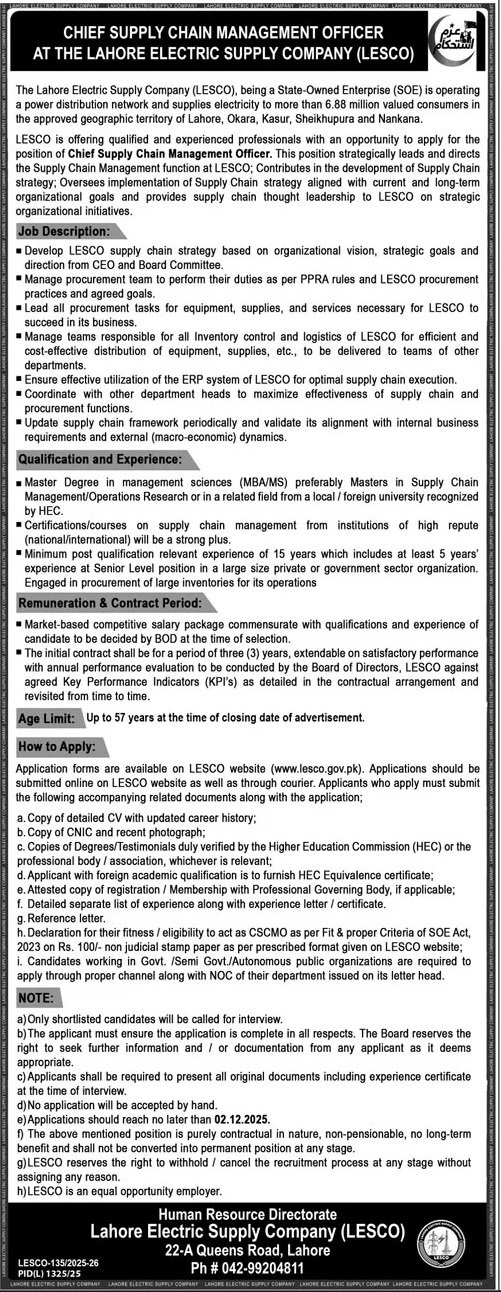 Lahore Electric Supply Company LESCO Jobs 2025 announce the Contract career opportunities for the post of See Below Ad in Punjab, Lahore for the fresh and experienced candidates on Contract basis who have Check Advertisement degree. Posted date of this post is 16/11/2025 and the last date is 02/12/2025. if you are eligible for this job apply before due date.