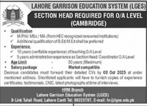 Lahore Garrison Education System LGES Jobs For Section Head announce the Contract career opportunities for the post of See Below Ad in Punjab, Lahore for the fresh and experienced candidates on Contract basis who have Check Advertisement degree. Posted date of this post is 18/09/2025 and the last date is 03/10/2025. if you are eligible for this job apply before due date.