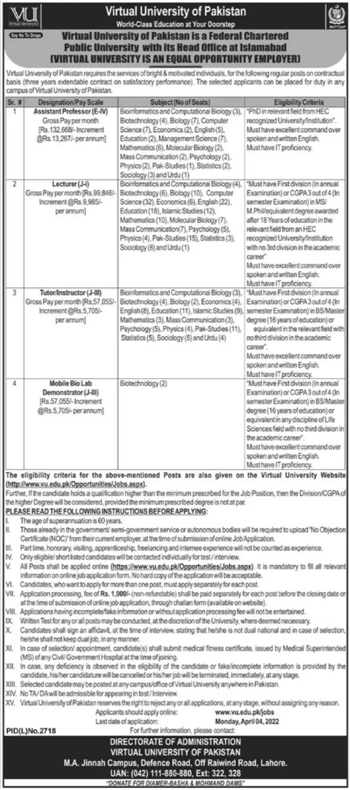 Latest jobs in Virtual University of Pakistan at Lahore announce the Contract career opportunities for the post of See Below Ad in Punjab,Lahore for the fresh and experienced candidates on Contract basis who have Check Advertisement degree. Posted date of this post is 07/03/2022 and the last date is 04/04/2022. if you are eligible for this job apply before due date.