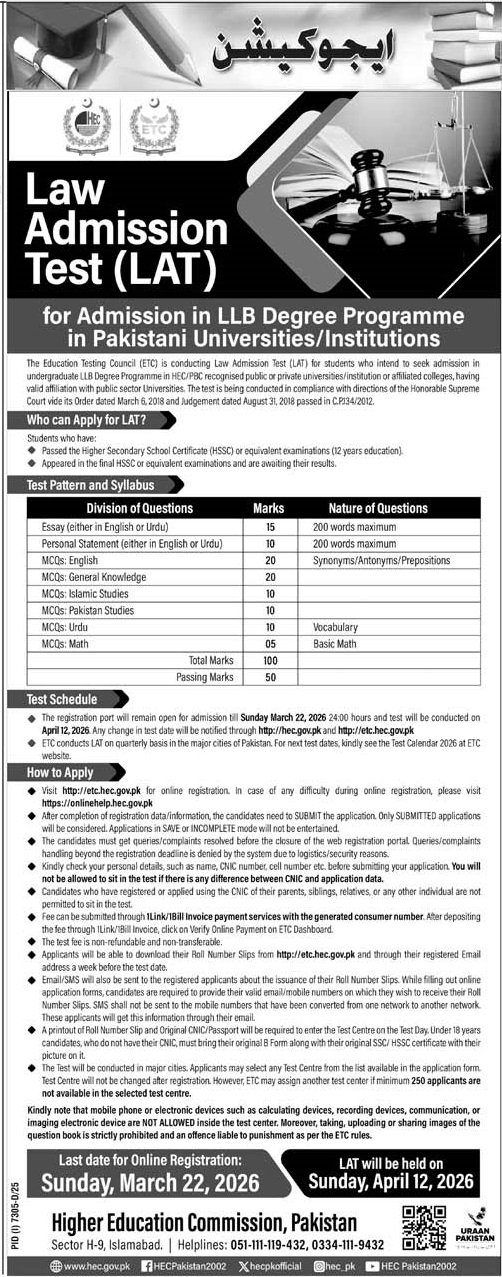Law Admission Test (LAT) Islamabad 2026 announce the Contract career opportunities for the post of See Below Ad in Federal, Islamabad for the fresh and experienced candidates on Contract basis who have Check Advertisement degree. Posted date of this post is 08/03/2026 and the last date is 22/03/2026. if you are eligible for this job apply before due date.