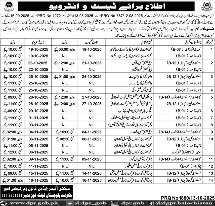The candidates who had submitted applications for the following vacant posts in the Law and Parliamentary Affairs Department, Quetta, through advertisements No. PRQ No 567/12-08-2025 dated 13-08-2025 and advertisement No. 1272 PRQ No dated 16-09-2025, for which the date was extended, are hereby informed that their tests and interviews will be held on the following dates at the respective district offices.