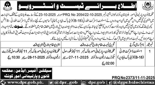 Law & Parliamentary Affairs Department Quetta Jobs Interview announce the Contract career opportunities for the post of See Below Ad in Balochistan, Quetta for the fresh and experienced candidates on Contract basis who have Check Advertisement degree. Posted date of this post is 12/11/2025 and the last date is 28/11/2025. if you are eligible for this job apply before due date.