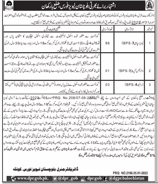 Levies Force Barkhan Jobs 2022 announce the Permanent career opportunities for the post of See Below Ad in Balochistan,Barkhan for the fresh and experienced candidates on Permanent basis who have Check Advertisement degree. Posted date of this post is 06/01/2022 and the last date is 31/01/2022. if you are eligible for this job apply before due date.