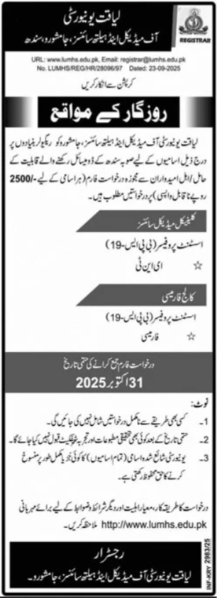 Liaquat University Of Medical & Health Sciences LUMHS Jobs announce the Contract career opportunities for the post of See Below Ad in Sindh, Jamshoro for the fresh and experienced candidates on Contract basis who have Check Advertisement degree. Posted date of this post is 27/09/2025 and the last date is 31/10/2025. if you are eligible for this job apply before due date.