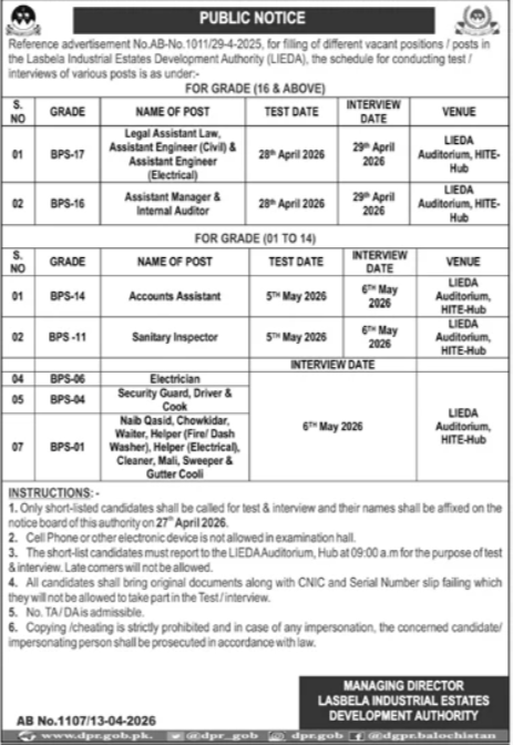 LIEDA Lasbela Industrial Estates Development Authority Jobs announce the Contract career opportunities for the post of See Below Ad in Balochistan, Bela for the fresh and experienced candidates on Contract basis who have Check Advertisement degree. Posted date of this post is 14/04/2026 and the last date is 06/05/2026. if you are eligible for this job apply before due date.