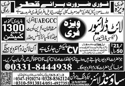 Light Driver & Taxi Driver Jobs 2025 In Qatar announce the Contract career opportunities for the post of See Below Ad in Qatar for the fresh and experienced candidates on Contract basis who have Check Advertisement degree. Posted date of this post is 01/11/2025 and the last date is 08/11/2025. if you are eligible for this job apply before due date.