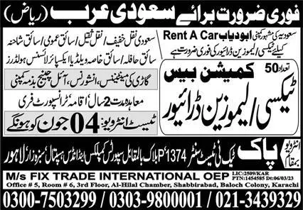 Limousine Driver & Taxi Driver Jobs 2023 In Saudi Arabia announce the Contract career opportunities for the post of See Below Ad in Saudi Arabia for the fresh and experienced candidates on Contract basis who have Check Advertisement degree. Posted date of this post is 03/06/2023 and the last date is 04/06/2023. if you are eligible for this job apply before due date.
