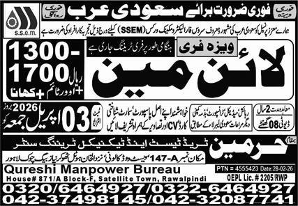 Line Man Jobs in Saudia Arabia 2026 announce the Contract career opportunities for the post of See Below Ad in Saudi Arabia for the fresh and experienced candidates on Contract basis who have Check Advertisement degree. Posted date of this post is 30/03/2026 and the last date is 03/04/2026. if you are eligible for this job apply before due date.
