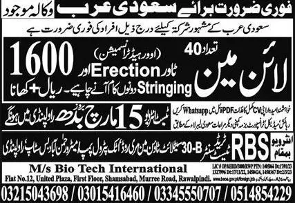 Lineman Jobs in Saudi Arabia 2023 announce the Contract career opportunities for the post of See Below Ad in Saudi Arabia for the fresh and experienced candidates on Contract basis who have Check Advertisement degree. Posted date of this post is 13/03/2023 and the last date is 15/03/2023. if you are eligible for this job apply before due date.