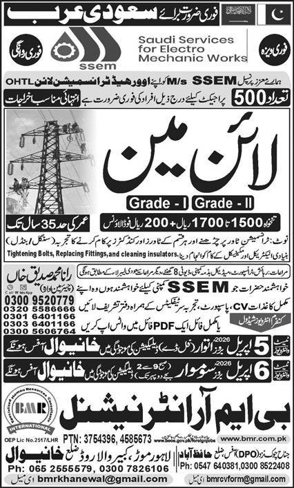 Lineman Jobs Open In Saudi Arabia 2026 announce the Contract career opportunities for the post of See Below Ad in Saudi Arabia for the fresh and experienced candidates on Contract basis who have Check Advertisement degree. Posted date of this post is 02/04/2026 and the last date is 06/04/2026. if you are eligible for this job apply before due date.