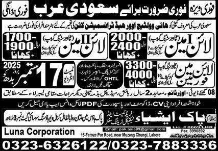 Lineman & Lineman Foreman Jobs 2025 In Saudi Arabia announce the Contract career opportunities for the post of See Below Ad in Saudi Arabia for the fresh and experienced candidates on Contract basis who have Check Advertisement degree. Posted date of this post is 12/09/2025 and the last date is 17/09/2025. if you are eligible for this job apply before due date.