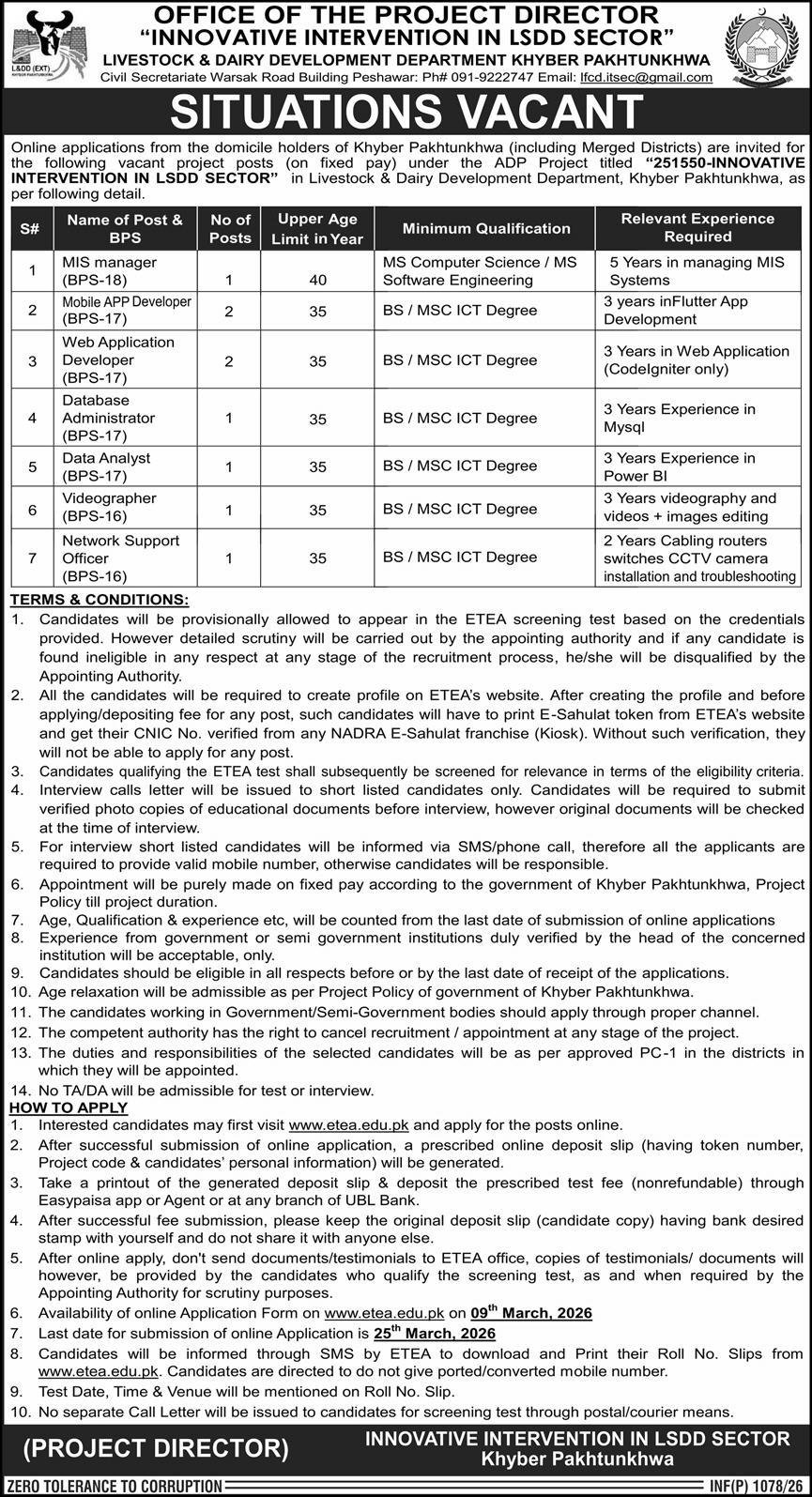 Livestock And Dairy Development LSDD Peshawar Jobs 2026 announce the Contract career opportunities for the post of See Below Ad in Khyber Pakhtunkhwa, Peshawar for the fresh and experienced candidates on Contract basis who have Check Advertisement degree. Posted date of this post is 07/03/2026 and the last date is 25/03/2026. if you are eligible for this job apply before due date.