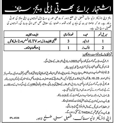 The office of the Deputy Director Livestock, Tehsil City, District Lahore, requires daily wage staff for the following temporary positions. Recruitment will be carried out purely on merit basis according to the prescribed rules and regulations. Details of the positions are as follows: