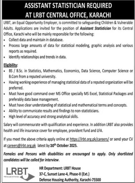 LRBT, an Equal Opportunity Employer, is committed to safeguarding Children & Vulnerable Adults. Applications are invited for the position of Assistant Statistician for its Central Office, Karachi who will be mainly responsible for the following: