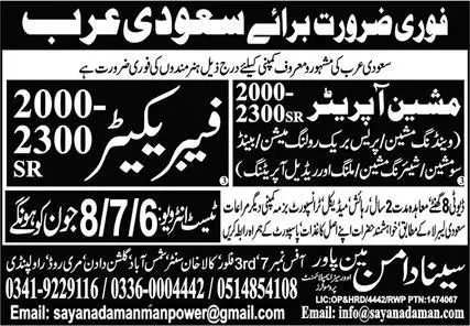 Machine Operator & Fabricator Jobs 2023 In Saudi Arabia announce the Contract career opportunities for the post of See Below Ad in Saudi Arabia for the fresh and experienced candidates on Contract basis who have Check Advertisement degree. Posted date of this post is 06/06/2023 and the last date is 08/06/2023. if you are eligible for this job apply before due date.