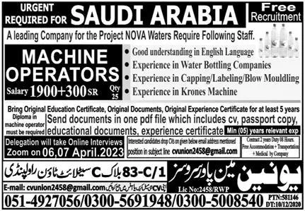 Machine Operators Jobs 2023 in Saudi Arabia announce the Contract career opportunities for the post of See Below Ad in Saudi Arabia for the fresh and experienced candidates on Contract basis who have Check Advertisement degree. Posted date of this post is 04/04/2023 and the last date is 07/04/2023. if you are eligible for this job apply before due date.