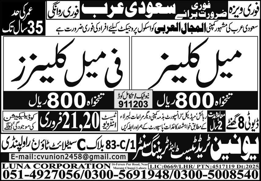 Male Cleaner & Female Cleaner Jobs 2026 In Saudi Arabia announce the Contract career opportunities for the post of See Below Ad in Saudi Arabia for the fresh and experienced candidates on Contract basis who have Check Advertisement degree. Posted date of this post is 19/02/2026 and the last date is 21/02/2026. if you are eligible for this job apply before due date.